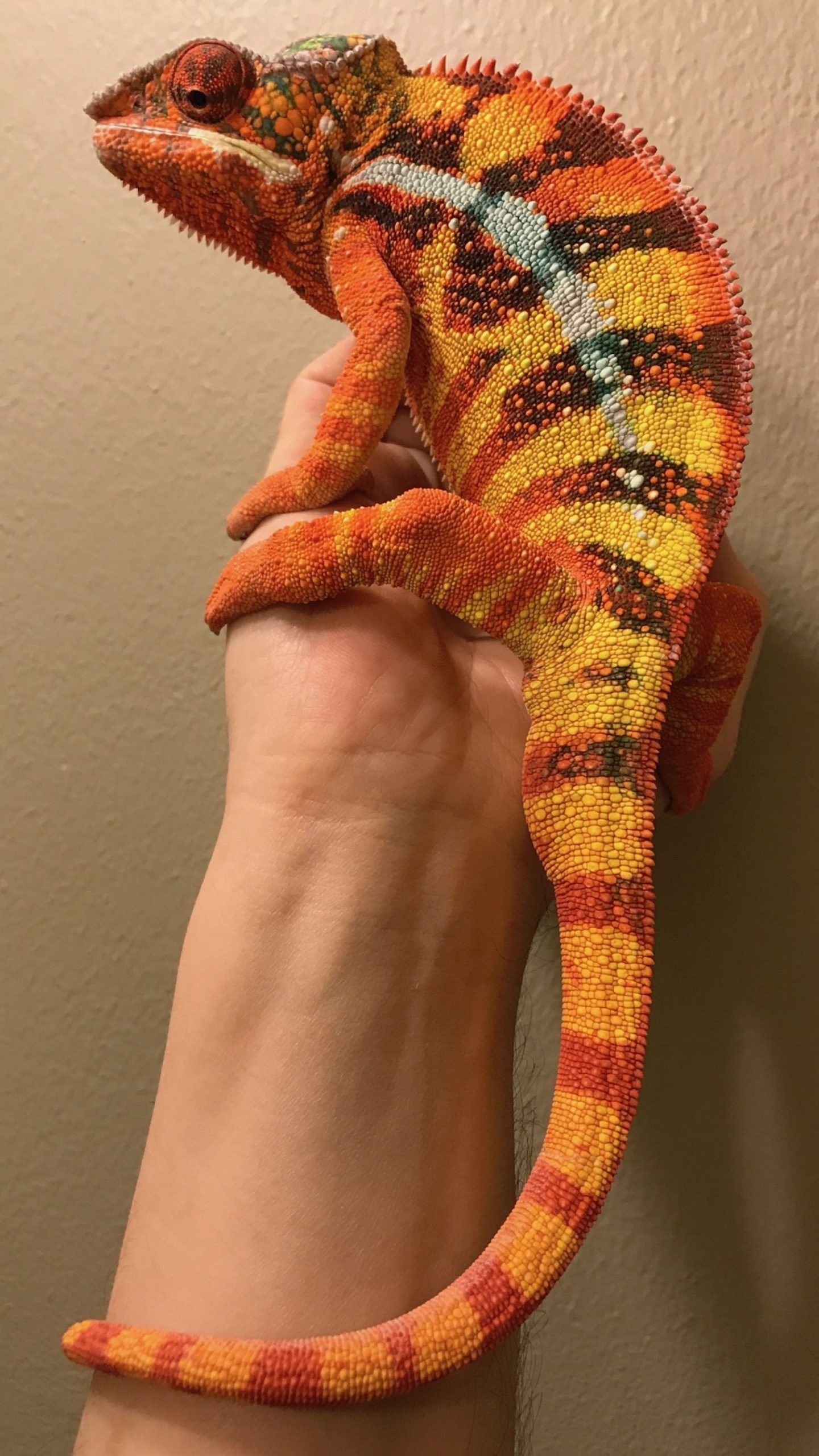 - Handling and Socialization: While the Angalovana Panther Chameleon may tolerate gentle handling, they are primarily a display pet and do not require frequent handling. They are sensitive creatures and can become stressed or injured if mishandled. Observe them from a distance and provide a stress-free environment to promote their well-being.