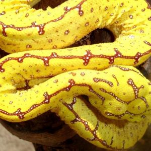 The Baby Jayapura Green Tree Python is renowned for its striking emerald green coloration. This species showcases a vibrant shade of green that allows it to blend seamlessly into the lush canopies of its natural habitat. The snake’s scales have a glossy appearance, further enhancing its beauty. As the snake matures, it develops a contrasting yellow coloration on its head and neck, adding to its visual appeal.