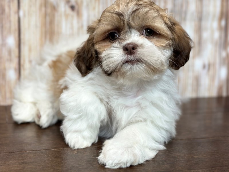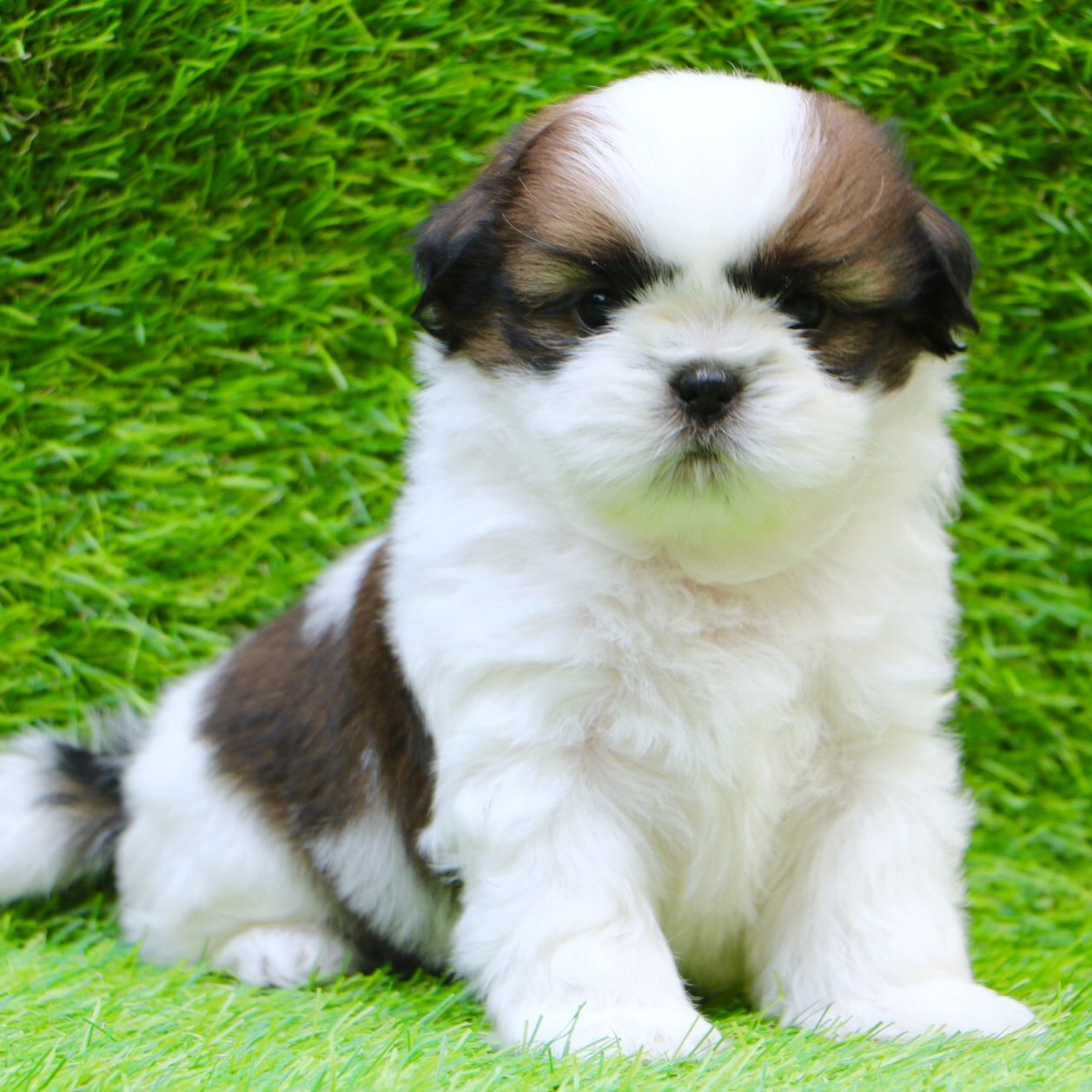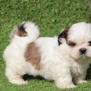 Shih Tzu puppies are known for their small size, typically weighing between 9 to 16 pounds when fully grown. They have a distinctive flat face, expressive eyes, and a luxurious double coat that comes in various colors, including gold, white, black, and combinations of these. Despite their small stature, Shih Tzus are sturdy and well-built dogs with a playful and lively personality.
